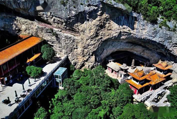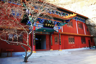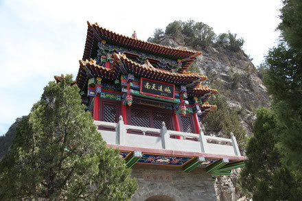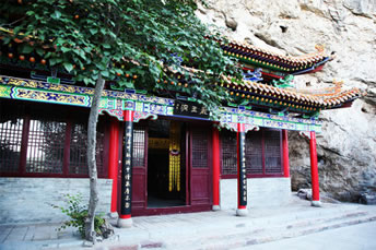 龍王洞在天竺寺景區(qū),位于石膏山上巖溶洞之東側(cè),洞高5米,寬8米,深10米許,洞內(nèi)建龍王祠。龍王祠面闊一間。洞前辟有四級(jí)平臺(tái),紅條石漫地,松柏間植,環(huán)境幽雅。洞東通一小洞,深不可測(cè),洞口壁上有赭紅字跡“龍水宮”;洞內(nèi)泉水汩汩而出,清澈異常。洞外崖壁石縫間平生一株山桃,主桿直徑不過(guò)10厘米,貼地生出百十根分枝,呈扇面狀!吧让妗庇3米多長(zhǎng)、2米多寬。每逢陽(yáng)春三月,滿樹桃花盛開,有如鳳凰展翅。這就是石膏山古景之一的“龍鳳呈祥”。 |