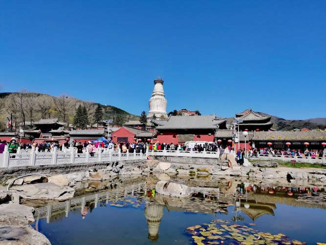 位于塔院寺后,現(xiàn)存建筑為明清兩代所修,寺宇面積八萬(wàn)余平方米,各種建筑四百余間。中軸線上殿堂七重,自前至后分別為觀音殿、文殊殿、大佛殿、無(wú)量殿、千缽殿、銅殿、藏經(jīng)殿。無(wú)量殿來說,高達(dá)21米,沒有一根梁木,全用磚塊砌成,外檐磚刻斗拱花卉,內(nèi)雕藻井懸空,形似花蓋寶頂,建造奇特。殿內(nèi)的《華嚴(yán)經(jīng)》字塔,為白綾所組成,上書60多萬(wàn)字的《華嚴(yán)經(jīng)》,蠅頭小楷,工整秀麗。銅殿三間見方,高達(dá)五米,外面雕鑄著花卉人物,飛禽走獸。