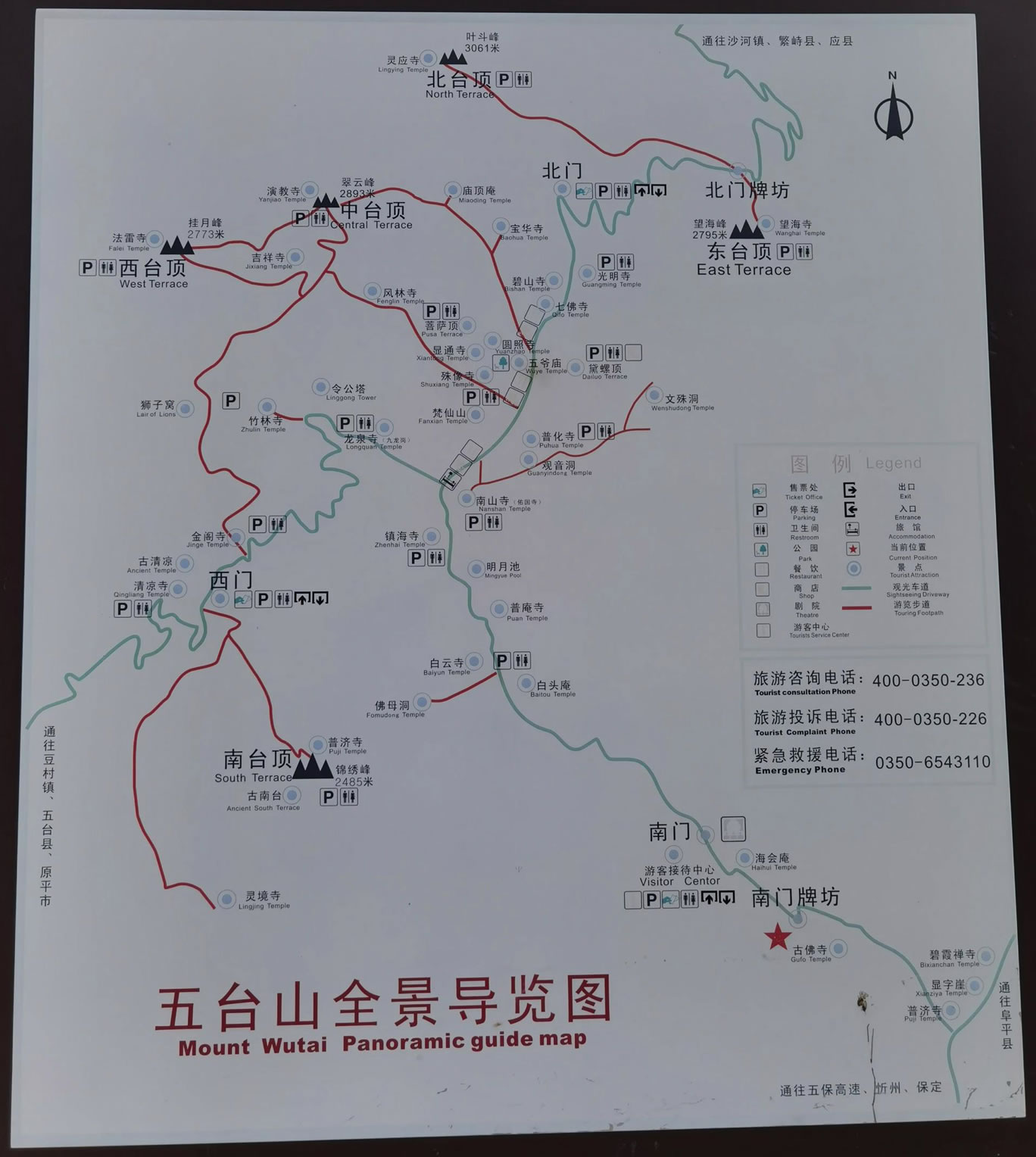 五臺(tái)山,方圓250公里,總面積2837平方公里。以臺(tái)懷鎮(zhèn)為中心,周圍屹立著東、西、南、北、中五個(gè)山峰,高出云表,山頂無(wú)林木,如壘土之臺(tái),稱作五臺(tái)。最高點(diǎn)北臺(tái)葉斗峰海拔3058米,被稱為“華北屋脊”。