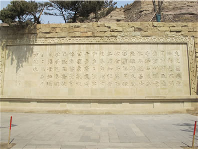 位于云岡石窟一窟山門前的“比丘尼曇媚造像記”石刻,為公元503年(景明四年)的題記。此碑刻有文字110個(gè),再現(xiàn)了當(dāng)時(shí)的社會(huì)背景,表達(dá)了發(fā)愿人比丘尼曇媚對(duì)佛教的高度信仰與虔誠(chéng)以及希望佛教振興發(fā)展的愿望,文筆優(yōu)美,堪稱佛教發(fā)愿文之最。此碑也向我們展示了北魏時(shí)期一種特有的字體。因這種字體在當(dāng)時(shí)多用于碑文,所以后人稱它為魏碑體。魏碑字體外方內(nèi)圓、拙樸有力,是隸書向楷書過(guò)渡的字體。由此看來(lái),魏碑書法應(yīng)是北魏平城時(shí)的創(chuàng)造。原物很小,只有30厘米高,28厘米寬,于1956年20窟前考古發(fā)掘,現(xiàn)存于云岡博物館中。