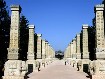 所謂禮佛大道:“恩澤普武周,慈航通法岸”。向西走去,十三對(duì)千佛列柱依次列于禮佛大道兩側(cè)。神柱高8.73米,系黃沙巖雕刻,由下而上依次為須彌座、力士、白象、柱體的完美組合,造型高聳、精致亙絕,在兩側(cè)濃密的松林掩映下,矗立的神柱氣勢(shì)雄偉、蔚為壯觀,仿佛通天入地,也仿佛唯有這樣的神柱鋪成的路才可以叫做禮佛大道。千佛列柱的原型在第9、10窟,第12窟,第14窟等處,均以大象、獅子等神物馱承,立體而又恢弘,呈現(xiàn)出平城時(shí)期北魏皇宮的恢弘模樣。