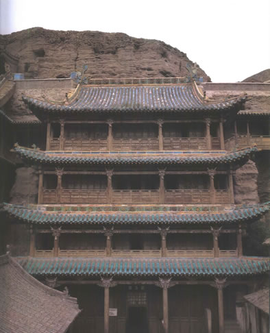 第5窟位于云岡石窟群中部,與第6窟是一組統(tǒng)一設(shè)計(jì)、建造的雙窟,屬于云岡中期洞窟?咄飧饔幸蛔屙樦伟四昙由w的四層五間式木構(gòu)閣樓,清代號(hào)稱“云岡佛閣”或“石窟摩云”,為云中八景之一。這對(duì)豎式設(shè)計(jì)的雙子佛閣,既亭亭玉立,又合璧莊重,體現(xiàn)了我們祖先工匠對(duì)石窟寺殿宇的精準(zhǔn)理解,也是目前云岡石窟僅存的古代窟檐建筑。它除了具有佛殿功能外,同時(shí)還起到遮風(fēng)擋雨作用,特別是保持了窟內(nèi)溫濕度的相對(duì)恒定,使得第5、6窟的造像雕刻保存狀態(tài)遠(yuǎn)優(yōu)于其它無(wú)窟檐的洞窟。