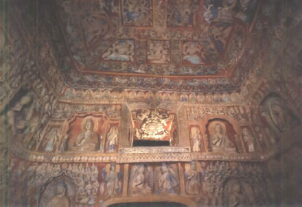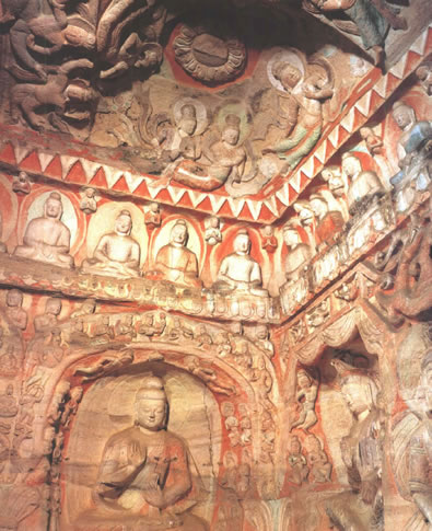 后室北壁頂部三角紋帶雕刻之下有上、下兩層大龕,下龕為圓拱龕,高4米,龕內(nèi)雕坐佛。上龕為盝形帷幕龕,龕內(nèi)中央為倚坐佛,兩側(cè)各有一交腳菩薩,最外兩側(cè)為思惟菩薩。龕楣十二格內(nèi)各雕一身飛天,龕楣上方雕有十四身伎樂(lè)天。