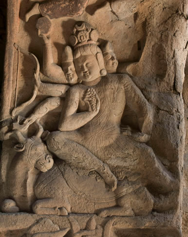 窟門拱頂正中雕一朵團(tuán)蓮,四周飛天起舞。內(nèi)側(cè)上拱邊框?yàn)檫B續(xù)排列的忍冬葉,周圍雕伎樂(lè)天人。拱內(nèi)側(cè)壁分為上下層,下層為天王門神,逆發(fā)胡人形象,手持金剛杵或三叉戟。上層雕出多頭多臂神像,東壁雕三頭四臂,西壁雕三頭六臂。