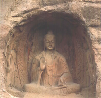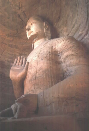 早期石窟:即今第16~20窟,亦稱為曇曜五窟。根據(jù)《魏書·釋老志》(卷114)記載:“和平初,師賢卒。曇耀代之,更名沙門統(tǒng)。初,曇耀于復(fù)法之明年,自中山被命赴京,值帝出,見(jiàn)于路,御馬前銜耀衣,時(shí)人以為馬識(shí)善人,帝后奉以師禮。曇曜白帝,於京城西武州塞,鑿山石壁,開(kāi)窟五所,鐫建佛像各一,高者七十尺,次六十尺,雕飾奇?zhèn),冠于一世!蔽闹杏浭龅拈_(kāi)窟五所,就是當(dāng)時(shí)著名的高僧曇曜就選擇了鐘靈毓秀的武州山,開(kāi)鑿了雄偉壯觀的曇曜五窟,揭開(kāi)了云岡石窟開(kāi)鑿的序幕。第16~20窟即帝王象征的曇曜五窟,以造像的風(fēng)格和創(chuàng)作的技法來(lái)看,是云岡全窟群中最早的五個(gè)窟。平面為馬蹄形,穹隆頂,外壁滿雕千佛。主要造像為三世佛(過(guò)去、現(xiàn)在、未來(lái)),佛像高大,面相豐圓,高鼻深目,雙肩齊挺,顯示出一種勁健、渾厚、質(zhì)樸的造像作風(fēng)。其雕刻技藝?yán)^承并發(fā)展了漢代的優(yōu)秀傳統(tǒng),吸收并融合了古印度犍陀羅、秣菟羅藝術(shù)的精華,創(chuàng)造出具有獨(dú)特的藝術(shù)風(fēng)格,這是中外融合所形成的新的藝術(shù)風(fēng)格。