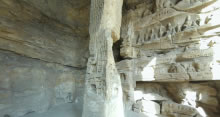 第7窟前室北壁上開(kāi)明窗,下鑿窟門,壁面風(fēng)化嚴(yán)重,但其窗門外側(cè)殘留的多層造像與印度阿旃陀的大拱門洞窟外壁雕刻十分相似。第7窟前室東壁上部均分層分欄雕刻佛本生故事畫面。后室北壁造像分為上下兩層大龕,下層龕內(nèi)為二佛并坐。上層龕內(nèi)中央主像為交腳彌勒菩薩,兩側(cè)為倚坐佛像。