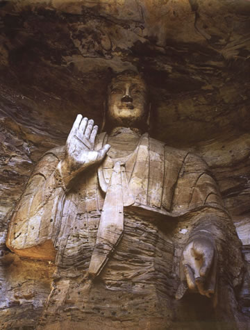 第19窟主佛像結(jié)跏趺坐,佛像耳輪齊肩,下頜崩毀,著袒右肩袈裟,輕薄貼體,衣紋簡(jiǎn)潔明快。佛像右手舉胸施無(wú)畏印,左手掌心向上握法衣于膝上,以表達(dá)佛法的無(wú)畏與傳承。窟外東西耳洞中,各雕刻一尊倚坐佛像,西耳洞佛像,耳廓寬大垂肩,體魄挺拔勁健。這種分窟安置三世佛的布局設(shè)計(jì),既有變化,又顯莊嚴(yán),是北朝石窟形制的新創(chuàng)舉。