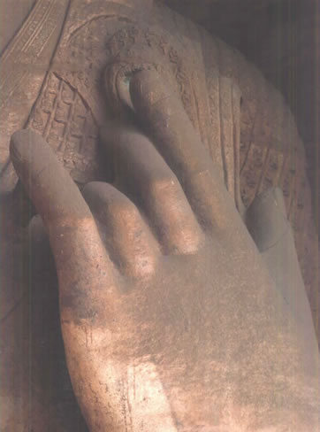 大佛兩側(cè),原本各有立佛、立菩薩,呈三世佛、五尊像布局,可惜今天僅有東壁一佛獨(dú)立。東立佛高約9.5米,磨光肉髻,圓臉大耳,深目高鼻,著通肩式佛衣;右手舉在胸前,施無(wú)畏印,左手握衣角下垂,跣足立于蓮臺(tái)之上。其衣紋雕刻與造像特征,極具西域藝術(shù)神韻。西壁立佛,大約當(dāng)年與東立佛相對(duì)侍立,但早已坍塌無(wú)形,現(xiàn)在僅殘留圓形頭光和赤裸的雙足及其蓮臺(tái)。