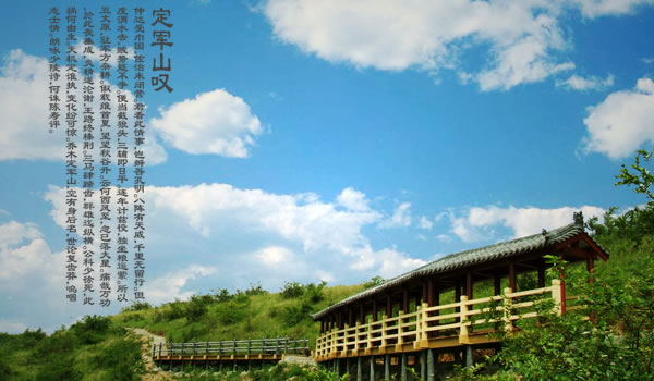 定軍山:定軍山位于陜西省漢中市勉縣城南5千米,三國時期古戰(zhàn)場。為省級風(fēng)景名勝區(qū)。原屬武侯墓鄉(xiāng),今屬定軍山鎮(zhèn)轄區(qū)。三國時,蜀將黃忠斬夏侯淵、趙顒于此,在歷史上遂負(fù)盛名。屬大巴山脈,其脈自高廟子入平地,隆起秀峰12座,自石山子至元山子,號稱“十二連峰”,再東為當(dāng)口寺孤峰,自西向東綿延十多公里,如游龍戲珠,故有“十二連山一顆珠”之譽。主峰定軍山為最高處,海拔833米,山頂原有“古定軍山”石碑,文革被毀,今新立。山南有一個天然鍋底形的大洼,周長1.5千米,即三國時稱為“可屯萬兵”的“仰天洼”。北麓有一片廣漠沃野,就是當(dāng)年諸葛亮大布“八陣圖”、設(shè)“督軍壇”的武侯坪,黃忠大戰(zhàn)夏侯淵的戰(zhàn)場,時常發(fā)現(xiàn)“扎馬釘”和箭鏃,傳為蜀軍用兵之物;山旁有“斬將橋”,“八角琉璃井”井口八角形,薄頁細(xì)花紋漢磚砌成,皆不存。山半腰有一大石,高約3.3米,寬約2米,中開一縫,寬窄不一,名曰“擋箭牌”,傳為諸葛亮遮擋敵箭的遺物。