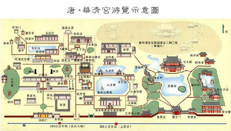 從文獻(xiàn)記載和野外的實際考察中,大抵可知華清宮的范圍是:南至驪山西繡嶺第一峰(即周烽火臺),北到今縣城北什字。東至石甕谷(寺溝)。西到鐵路療養(yǎng)院西側(cè)的牡丹溝。宮城(即羅城),南至山根,北到今縣城南什字,東至東窯村,西到游泳池。1967年新華書店在南什字西北角修建營業(yè)樓,發(fā)現(xiàn)了用青石砌成的宮城北墻的墻基。1981年春,城建單位在西街丁字形路北,也發(fā)現(xiàn)了同樣的北墻基。1982年冬于寺溝村南的山坡上探出東繚墻兩段。從調(diào)查和發(fā)掘所見遺跡及文獻(xiàn)資料所記,華清宮的建筑布局嚴(yán)謹(jǐn),曲折縈回,規(guī)模宏大。唐玄宗以民脂民膏,建此豪華宮苑,供一己之歡娛,然曾幾何時,“漁陽鼙鼓”驚破了他的美夢。華清宮樓殿湯池,遂漸次破壞,自宋以至明清,其原有建筑已蕩然無存。記其遺跡,乃以彰我民族之文化,并以此為借鑒,建立一個新時代的風(fēng)景旅游區(qū),供廣大人民群眾游覽。唐代華清宮充分利用了有利地形,使其成為一座結(jié)構(gòu)嚴(yán)謹(jǐn)、富麗堂皇的龐大宮殿建筑群。主要殿舍以溫泉為中心,構(gòu)成華清宮的核心。然后向山上和山下展開,利用地形特點,布設(shè)不同類型和用途的樓閣亭榭,同時還有青松翠柏、荔枝園、芙蓉園、梨園、椒園、東花園等分布其間,把整個華清宮妝扮得格外妖嬈。華清宮的建筑依山面水,鱗次櫛比,除宮城(羅城)外,還有繚墻環(huán)繞?潐χ,又羅列不少建筑,清乾隆《臨潼縣志》稱:“湯井殊名,殿閣異制,園林洞壑之美,殆非人境”。