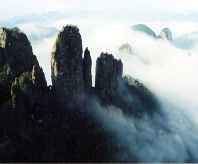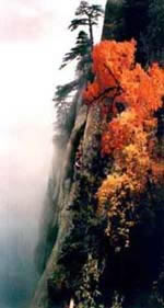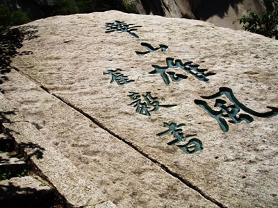 東峰頂生滿巨檜喬松,濃蔭蔽日,環(huán)境非常清幽。游人自松林間穿行,上有團(tuán)才綠蔭,如傘如蓋,耳畔陣陣松濤,如吟如詠,頓覺心曠神怡,超然物外。明書畫家王履在《東峰記》中談他的體會說:高大的檜松蔭蔽峰頂,樹下石徑清爽幽靜,風(fēng)穿林間,松濤涌動更添一段音樂般的韻致,其節(jié)律,此起彼伏,好象吹彈絲竹,敲擊金石,多么美妙啊。
