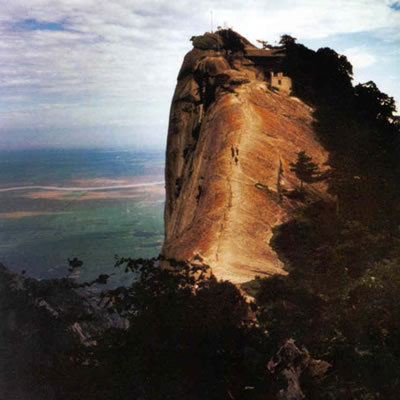 西峰海拔2082米,華山主峰之一,因位置居西得名。又因峰巔 有巨石形狀好似蓮花瓣,古代文人多稱其為蓮花峰、芙蓉峰。袁宏道在他的《華山永》中記述:“石葉上覆而橫裂”;徐霞客《游太華山日記》中也記述:“峰上石聳起,有石片覆其上,如荷花!崩畎自娭杏小笆魃徎ㄔ谱髋_”句,也當(dāng)指此石。