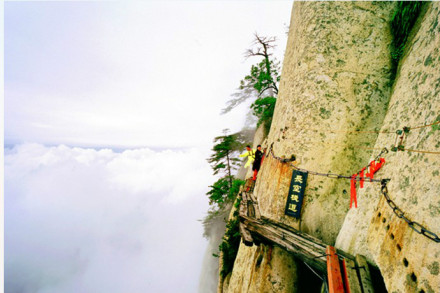 余處,有凌空架設(shè)的長空棧道,三面臨空的鷂子翻身,以及在峭壁絕崖上鑿出的千尺幢、百尺峽、老君犁溝等。其中華岳仙掌被列為關(guān)中八景之首。