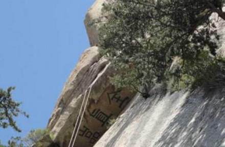 關(guān)于全真巖各類史志書籍記載頗多!度艌D會》載:“靜室旁有巖,高數(shù)十丈,遙覆其室,并書‘全真巖’三字!薄度A岳圖經(jīng)》中記述,全真巖三字每字大約七八尺高,鐫刻在那樣一個地方,除過能騰云駕霧的神仙,凡夫俗子肯定是辦不到的。明書畫大家王履的《南峰記》中記述得列為形象:巖好像一個彎腰人的頭部,遠(yuǎn)遠(yuǎn)遮蓋住腹部的石室。倒坎巖頂端鐫“全真巖”三字,并涂以紅色。世上沒有神仙,刻字肯定是人類所為,但在這樣特殊的位置,上不可上,下不可下,除非懸浮于空中才能可能。古人是如何做到這一點(diǎn),迄今無解。