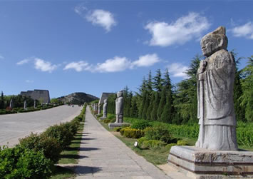 從梁山南二峰的天然雙闕起,往北依次對(duì)稱排列。端立首位的是1對(duì)高達(dá)8米有余的八棱柱石華表,這是帝王陵墓的標(biāo)志,其造型昭示著生命長(zhǎng)存的理念和古代先民對(duì)人類生殖行為的崇拜。接著是一對(duì)昂首挺胸、渾圓壯觀的石刻翼馬,馬身兩翼雕以卷云紋,似有騰飛之勢(shì)。翼馬之北是1對(duì)優(yōu)美的高浮雕鴕鳥(niǎo),是唐王朝同西域人民文化交流與友好往來(lái)的象征。緊接鴕鳥(niǎo)的是5對(duì)配有馭手的石仗馬和10對(duì)高4米左右的石翁仲(或稱直閣將軍)。