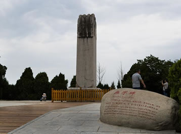 在朱雀門(mén)外的司馬道東側(cè),聳立著聞名于世的無(wú)字碑,通身取材于一塊完整的巨石,高7.53米,寬2.1米,厚1.49米,總重量98.8噸,給人以凝重厚實(shí),渾然一體的美感。碑額未題碑名,碑額陽(yáng)面正中一條螭龍,左右側(cè)各四條,共有九條螭龍,故亦稱“九龍碑”。碑的兩側(cè)有升龍圖,各有一條線刻而成騰空飛舞的巨龍,栩栩如生。碑座陽(yáng)面還有線刻的獅馬圖(或稱獅馬相斗圖),長(zhǎng)2.14米,寬0.66米。其馬屈蹄俯首,雄獅則昂首怒目。碑上還有許多花草紋飾,線條精細(xì)流暢。