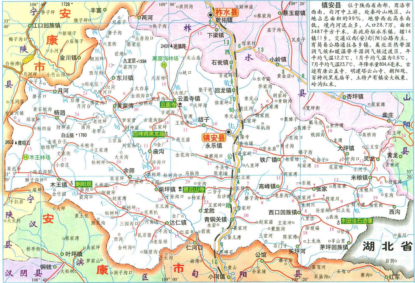 鎮(zhèn)安縣位于秦嶺東段南麓, 位于北緯33.8'至33.48"57',東經108 34"35'至109 36"51'。距陜西省西安市195公里,離商洛市178公里。面積3487平方公里。縣委、縣政府駐地永樂鎮(zhèn)(謝家彎)縣城前街188號。境內最高點為楊泅鄉(xiāng)鷹嘴石,海撥2601.6米,最低點是龍勝鄉(xiāng)詢河村河谷,海撥344米,高低落差2257.6米,地勢西北向東南傾斜;屬長江水系漢江支流;年均降雨量804.4毫米,年平均氣溫12.2℃,屬亞熱帶半濕潤氣候。