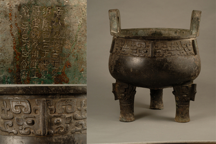 鑄于周康王時期,造型敦厚雄偉,紋飾莊重神奇。通高77厘米,口徑56.5厘米。立耳,深腹,平沿方唇,三柱足。口沿下飾浮雕狀饕餮紋,地襯細(xì)雷紋。三足根部飾大饕餮面。雙耳外側(cè)各飾一條曲體上緣的夔龍。腹外壁及底部厚積煙跡,顯系長期使用所致。腹內(nèi)壁鑄有銘文28字。旟鼎承襲商代圓鼎風(fēng)格,造型厚重莊嚴(yán),紋飾十分精美,所刻銘文是研究周初土地制度的重要史料,具有珍貴的歷史及藝術(shù)價值,加之鑄刻時代明確,被公認(rèn)為周康王時的標(biāo)準(zhǔn)器,是一尊著名的西周時期的國寶。