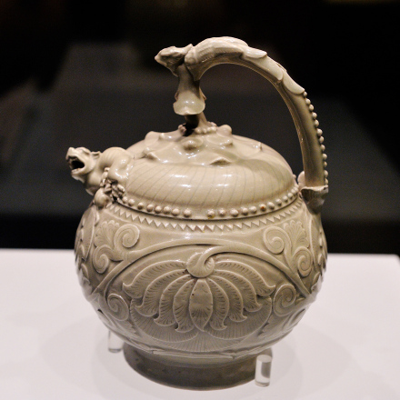 這件提梁倒灌壺是著名的耀州窯(窯址在今陜西省銅川市王益區(qū)黃堡鎮(zhèn))產(chǎn)品。耀州窯是唐宋時中國北方名窯,時人推崇耀瓷“巧如范金,精比琢玉”。此壺造型古樸典雅,制作規(guī)整精細(xì),紋紋繁褥華麗,尤其是構(gòu)思奇特,設(shè)計巧奪天工,被認(rèn)為是國內(nèi)外存世耀州窯瓷器中最為精美的一件。