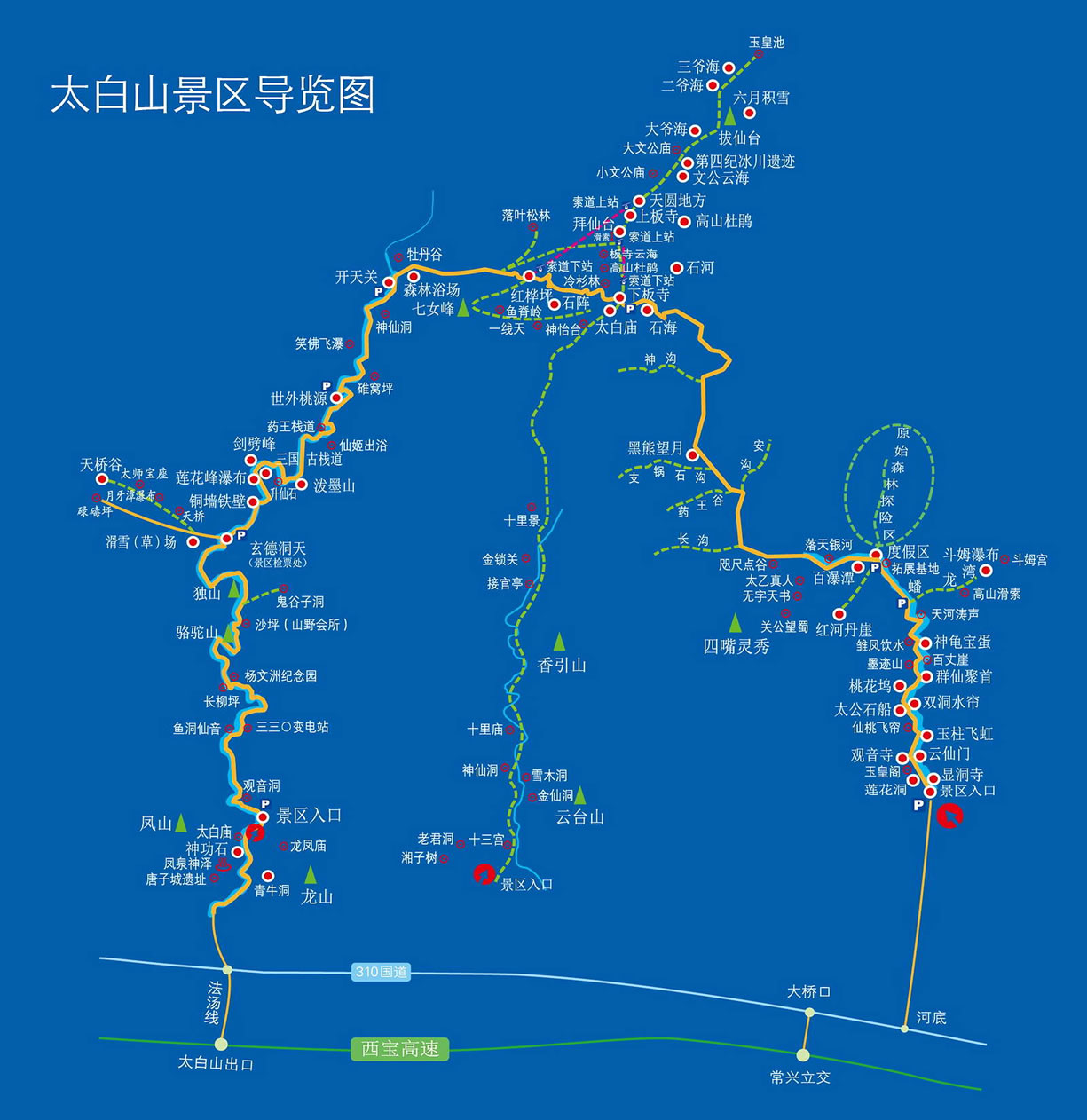 太白國家森林公園以園內(nèi)40公里旅游公路和28公里人行旅游步道聯(lián)結(jié)公園八個(gè)景區(qū)140多個(gè)景物景點(diǎn),其主要的景區(qū)景點(diǎn)有: