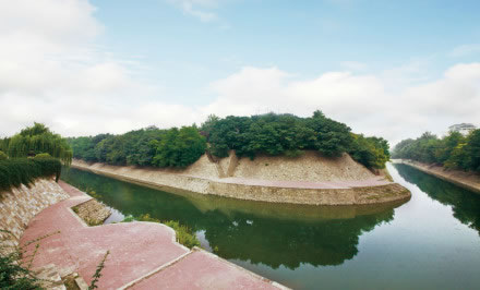 明西安城墻之外,環(huán)繞有護(hù)城河一周,與城墻共同組成了明西安城的防御體系。護(hù)城河也簡稱城河,有的城河長年無水,呈干溝狀態(tài),則稱為“城壕”或“壕溝”。明代所建西安護(hù)城河,環(huán)城一周,全長在14公里之上。西安城墻主墻與城河沿間距約28米,而城墻上突出的馬面,與城河間距則少要10米左右。西安城壕的寬度不一,是因為西安城外之壕不是旱溝,而是行水之溝,一般以底部為準(zhǔn),有一定之高程,上口則隨地形之高差不同而深淺不一。較深處在城南,城北較淺。城南一段城河口部闊者大約45米上下。
