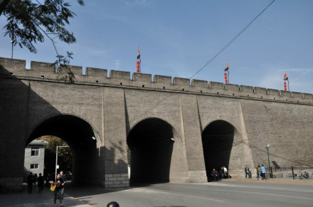 中山門并列兩個門洞,馮分別為它們?nèi)∶皷|征門”和“凱旋門”。出師之日,馮玉祥在城頭向各界歡送群眾講話,說等北伐勝利,再打開凱旋門歡迎他。但后來時局變化,再未率師回西安。中山門規(guī)格為雙門洞。