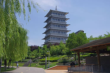 長安塔是西安世博園的標志性建筑,由中國工程院院士張錦秋設計,位于景區(qū)小終南山上;塔高99米,采用鋼結(jié)構(gòu)和玻璃構(gòu)件建成,地上七明層六暗層,地下一層;長安塔外形具有唐代傳統(tǒng)木塔的特點,一層挑檐上面有一層憑座,逐層收分;各層挑檐尺寸開闊上揚,體現(xiàn)唐代木結(jié)構(gòu)建筑出檐深遠的特點和風格;檐下與柱頭之間用金屬構(gòu)件組合,是傳統(tǒng)建筑檐下斗拱系統(tǒng)的抽象和概括;玻璃幕墻退在外槽柱內(nèi)側(cè),通過玻璃肋與柱,梁固定;長安塔的設計不但充滿了現(xiàn)代感,還凸顯了陜西本土歷史特色。