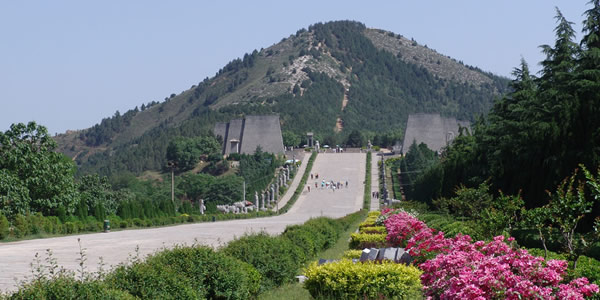 乾陵,是中國(guó)乃至世界上獨(dú)一無(wú)二的一座兩朝帝王、一對(duì)夫妻皇帝合葬陵。里面埋葬著唐王朝第三位皇帝高宗李治和中國(guó)歷史上唯一的女皇帝武則天,是全國(guó)重點(diǎn)文物保護(hù)單位。建于公元684年,歷時(shí)23年才修建完成。乾陵修建于公元684年,經(jīng)過(guò)23年的時(shí)間,工程才基本完工。氣勢(shì)雄偉壯觀(guān)。乾陵位于陜西咸陽(yáng)市乾縣城北6公里的梁山上。梁山是圓錐形石灰?guī)r山體,共有三峰,北峰最高,海拔1047.9米,乾陵就在北峰之上。梁山南面兩峰較低,東西對(duì)峙,中間為司馬道,故而這兩峰取名叫“乳峰”。據(jù)史書(shū)記載,陵墓原有內(nèi)外兩重城墻,四個(gè)城門(mén),還有獻(xiàn)殿闕樓等許多宏偉的建筑物?碧奖砻鳎簝(nèi)城總面積240萬(wàn)平方米。城墻四面,南有朱雀門(mén),北有玄武門(mén),東有青龍門(mén),西有白虎門(mén)。從乾陵頭道門(mén)踏上石階路,計(jì)537級(jí)臺(tái)階,其臺(tái)階高差為81.68米。走完臺(tái)階即是一條平寬的道路直到“唐高宗陵墓” 碑,這條道路便是“司馬道”。兩旁現(xiàn)有華表1對(duì),翼馬、鴕鳥(niǎo)各1對(duì),石馬5對(duì),翁仲10對(duì),石碑2道。東為無(wú)字碑,西為述圣記碑。有王賓像61尊,石獅1對(duì),周?chē)有17座陪葬墓。“唐高宗陵墓”墓碑,高2米,是陜西巡府畢源為高宗所立,原碑已毀,現(xiàn)在這塊碑是清乾隆年間重建的。此碑右前側(cè)另一塊墓碑,是郭沫若題寫(xiě)的“唐高宗李治與則天皇帝之墓”12個(gè)大字。另外在南門(mén)外有為高宗皇帝和武則天歌功頌德的《述圣記碑》和《無(wú)字碑》二通以及參加高宗葬禮的中國(guó)少數(shù)民族首領(lǐng)和友好國(guó)家使臣的石刻像六十一尊。在中國(guó)歷史上,陵前石刻的數(shù)目、種類(lèi)和安放位置是從乾陵開(kāi)始才有了固定制度的,一直延襲到清代,歷代大同小異。
