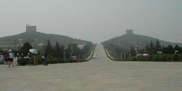 此景距縣城6公里,與乾陵渾然一體,乾陵朱雀門(mén)南面從兩乳峰之間通向獻(xiàn)殿的御道兩側(cè),豎有華表,石馬(翼馬)、駝馬、翁仲、述圣紀(jì)碑、無(wú)字碑、石獅、六十一賓王等大型精細(xì)石雕,120多尊依次排列。石馬在前,雙翅高振,凌空欲飛,栩栩如生,其他石雕左右配置,緊隨其后,魁梧奇?zhèn),氣象萬(wàn)千,被史學(xué)界譽(yù)為“唐代露天石雕藝術(shù)博物館”。近年來(lái),國(guó)家文物旅游局又投巨資,對(duì)34尊石雕扶直加固,對(duì)御道鋪石美化,使此景更加恢宏壯觀(guān)。