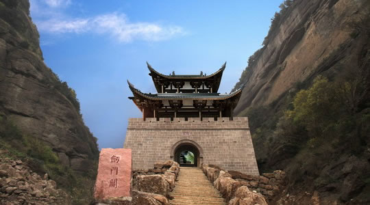 劍門關(guān)景區(qū):位于四川省廣元市劍閣縣北部,地處四川盆地北部邊緣斷褶帶,為龍門山脈劍門山支干,屬中生界白堊系下統(tǒng)的蒼溪組(城墻巖群劍門關(guān)組)地層,劍門關(guān)礫巖有巨厚塊狀紫灰色礫巖紫灰色泥巖石層,形成北陡南緩的單斜山,北坡陡峭,南坡緩斜,礫巖出露處多處多成懸崖峭壁,山高峰險(xiǎn),溝深谷狹。相對(duì)高差300米~600米。地理坐標(biāo)為:北緯32°08′10″~32°16′15″,東經(jīng)105°26′40″~105°37′54″,面積142平方公里。景區(qū)屬于亞熱帶濕潤(rùn)氣候區(qū),氣候溫和、雨量充沛、四季分明。多年平均溫度14.0°C,年平均降水量1075.1毫米,景區(qū)森林覆蓋率45%以上。