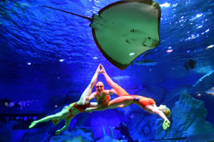 徜徉于多彩的海底世界,一覽多彩珊瑚、熱帶魚(yú)群以及兇猛的鯊魚(yú)構(gòu)成的海底世界。美麗的俄羅斯水秀演員、童話里的美人魚(yú),搖曳身姿,共同舞動(dòng)海底深處的視覺(jué)奇跡。探訪深海的馴養(yǎng)師也將攜手兇猛鯊魚(yú),演繹人鯊共舞。