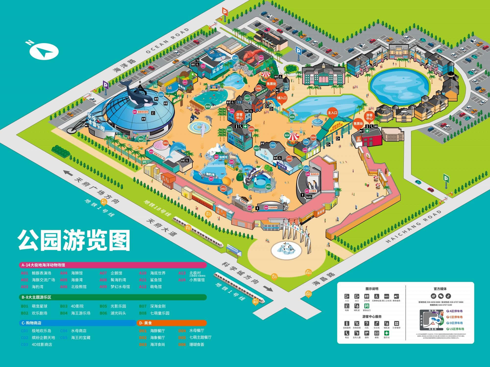 作為承載科普、互動(dòng)、歡樂(lè)、體驗(yàn)為一體,戶外游樂(lè)區(qū)+室內(nèi)動(dòng)物場(chǎng)館+大型演藝場(chǎng)結(jié)合的海洋主題公園,成都海昌極地海洋公園擁有鯨豚(白鯨、海豚)、北極熊、企鵝、海豹、海獅、萌龜、水母、北極狐、北極狼、小熊貓 [4] 等14大海洋動(dòng)物場(chǎng)館,以及海王游樂(lè)場(chǎng)(器械游樂(lè)設(shè)備)、萌寵星球(水陸空動(dòng)物互動(dòng)區(qū))、光影樂(lè)園、4D影院、深海金剛科技體驗(yàn)館、七萌童樂(lè)園(夏季為親水玩水區(qū))等8大主題游樂(lè)區(qū)。游客入園,還能欣賞到《鯨豚聯(lián)盟》、《人鯊共舞》、《海獅運(yùn)動(dòng)會(huì)》等海洋科普秀,夏日還有快樂(lè)無(wú)比的國(guó)際花車巡游和戲水狂歡限時(shí)上演。