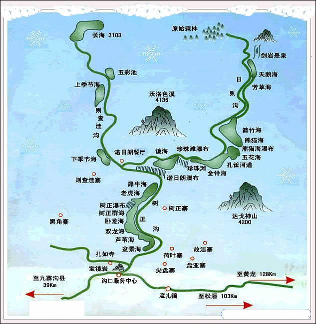 九寨溝國(guó)家級(jí)自然保護(hù)區(qū)地勢(shì)南高北低,山谷深切,高差懸殊,區(qū)北緣九寨溝口海拔僅2000米,中部峰嶺均在4000米以上,南緣達(dá)4500米以上,主溝長(zhǎng)30多千米。峰頂和兩側(cè)山峰基本終年積雪。九寨溝地處青藏高原向四川盆地過(guò)渡地帶,地質(zhì)背景復(fù)雜,碳酸鹽分布廣泛,褶皺斷裂發(fā)育,新構(gòu)造運(yùn)動(dòng)強(qiáng)烈,地殼抬升幅度大,多種營(yíng)力交錯(cuò)復(fù)合,造就了多種多樣的地貌,發(fā)育了大規(guī)?λ固刈饔玫拟}化沉積,以植物喀斯特鈣華沉積為主導(dǎo),形成九寨溝艷麗典雅的群湖,奔瀉湍急的溪流,飛珠濺玉的瀑群,古穆幽深的林莽,連綿起伏的雪峰。