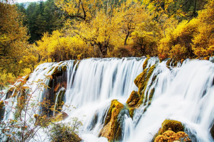 諾日朗瀑布海拔2343米,高24.5米、寬320米,是中國(guó)最寬的高山鈣華瀑布。滔滔流水自諾日朗群海而來(lái),從瀑頂樹叢中傾瀉而下,像數(shù)條潔白的哈達(dá),水勢(shì)浩大,聲震山谷。寒冬時(shí)節(jié),瀑布成了一幅巨大的冰幔,無(wú)數(shù)的冰柱懸掛在陡崖之上,成為罕見的冰晶世界,造型各異的冰雕迎光透著幽幽的藍(lán)色魅惑,是九寨溝六絕之一“藍(lán)冰”。