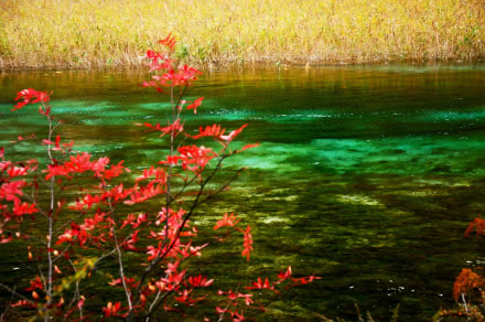 繽紛的落葉在湖光流韻間漂浮,悠遠(yuǎn)的晴空碧凈而湛藍(lán),秋天的九寨溝美得仿佛不真實(shí),無(wú)時(shí)無(wú)刻不在演繹著赤、橙、黃、綠、青、藍(lán)、紫的夢(mèng)幻組合,古人說(shuō)的“造化鐘神秀”,也就不過(guò)如此吧。