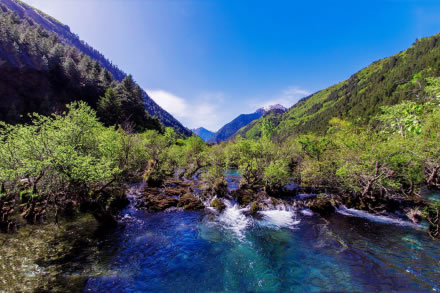 春風(fēng)吹拂,沉睡的九寨溝蘇醒了。冰雪融化,新綠發(fā)芽,春水的顏色映著山色,嬌嫩得讓人不忍探視,仿佛只要輕輕地一口氣都能讓它消失。水邊道旁,鬧哄哄開滿了不知名的美麗山花,桃紅、絳紫、靚藍(lán)、鵝黃,繁華似錦,爛漫一路。溫柔而慵懶的春陽(yáng)吻接湖面,愛(ài)撫春芽,也悸動(dòng)了你久閉的心門......
