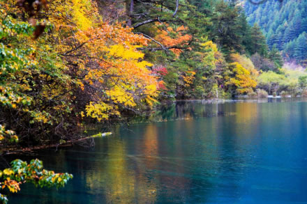 浪漫的秋風(fēng)也吹來(lái)了九寨溝最為燦爛的時(shí)節(jié)。山林暈染成色,除了綠色以外,還呈現(xiàn)出金黃、火紅等色彩,五彩繽紛,倒映在明麗的湖水中,湖山同色,湖水也斑斕似錦了,一時(shí)間竟然不能分清哪里是山哪里是水,十分迷人。