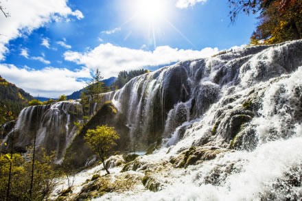 珍珠灘海拔2450米,灘面寬112.3米、長(zhǎng)189米,平均坡度20度,相對(duì)高差15米,是九寨溝最寬闊的灘面,為碳酸鈣沉積而成的大型鈣華堆積臺(tái)地。陽(yáng)光下,湍流在凹凸不平的灘面上宣泄而下,濺起無(wú)數(shù)水珠,宛如粒粒潔白的珍珠,晶瑩奪目,故得此名。