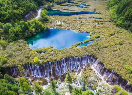 樹正群海海拔2187—2280米。其地形是在河谷迭加泥石流堆積物基礎(chǔ)上,再經(jīng)鈣華沉積,形成大小19個(gè)湖泊,順著溝谷層層迭迭。該處森林、湖泊、小瀑布相錯(cuò)相連,呈現(xiàn)“樹在水中生,水在林間流,人在畫中游”的奇特景觀。