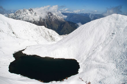 黑湖(黑海)藏名措拉,面積約5畝,深8米,這是相當(dāng)深、相當(dāng)?shù)湫偷囊粋(gè)冰斗湖遺跡。據(jù)資料所述,早年當(dāng)?shù)夭孛裉旌登笥陼?huì)到這個(gè)湖,湖上常年飄有低云,在下面大聲呼喊,上面的云就會(huì)落下雨滴。夏天的黑湖附近是一片草場(chǎng),冬日雪景又是另外一番景觀。