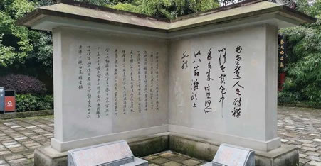 北宋著名詩人、書法家黃庭堅謫居戎州時,仿王羲之《蘭亭集序》“流觴曲水”之意,利用天然峽谷而建。池呈九曲形,立八石凳,引巖縫清泉為流,文人墨客列坐其間,可流杯飲酒,吟詩酬唱。此處巖壑清奇、古樹參天、意境清幽,為歷代文人雅士吟唱之所,是宜賓古八景之一。自宋迄今,詠贊之作繁多,或贊涪翁之高風,或頌筑池之勝績,或發(fā)思古之幽情,或懷時令之感慨,可謂霧集云屯,珠璣累累,頗富時代氣息,風采紛呈。一些詩詞歌賦在事后被勒刻于流杯池附近的巖、壑、洞、谷。據(jù)1985年統(tǒng)計,計有石刻題記128通,字跡基本完整的有64通,最早的紀年石刻為宋淳熙戊申(1189)年所刻。劉光弟、張大千、黃賓虹、張愛萍等人的字跡也躍然壁上。