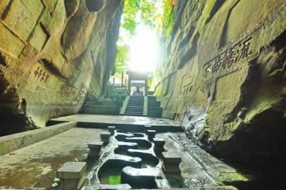 仿照東晉書法家王羲之蘭亭集會流觴曲水的意境,黃庭堅利用這峽谷的地形和天然泉水,修建了900多年來遐邇聞名的流杯池。保持其天然的山水景致是文人造園崇尚自然的山水理念,流杯池內(nèi),從谷底到崖壁頂,蜿蜒臺階而上,幾個平臺錯落其間,時而寬敞平緩,時而臨崖高懸,這樣的美景是黃庭堅在領會自然美的規(guī)律上進行的藝術再創(chuàng)造。