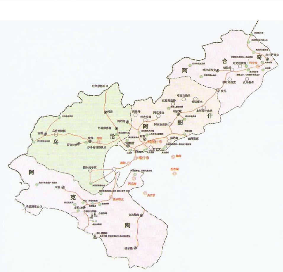 民國元年(1912年),境內(nèi)分轄于喀什行政區(qū)伽師縣、疏附縣、英吉沙縣、蒲犁縣和阿克蘇行政區(qū)烏什縣。民國二年(1913年)至民國三十三年(1944年),境內(nèi)先后建烏恰縣、阿圖什縣、阿合奇縣。