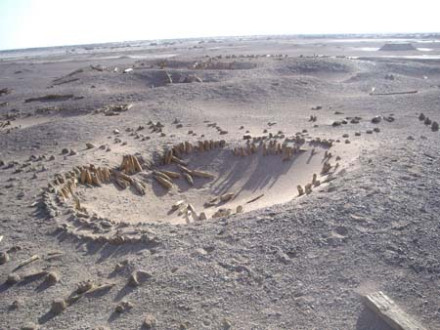 位于太陽墓地西側,在古河道北岸的一片臺地上,有成片的株距相等、行距相同、樹干尺余粗的枯死的胡楊林。這成排成行的枯樹,帶有明顯的人工營造的特征。