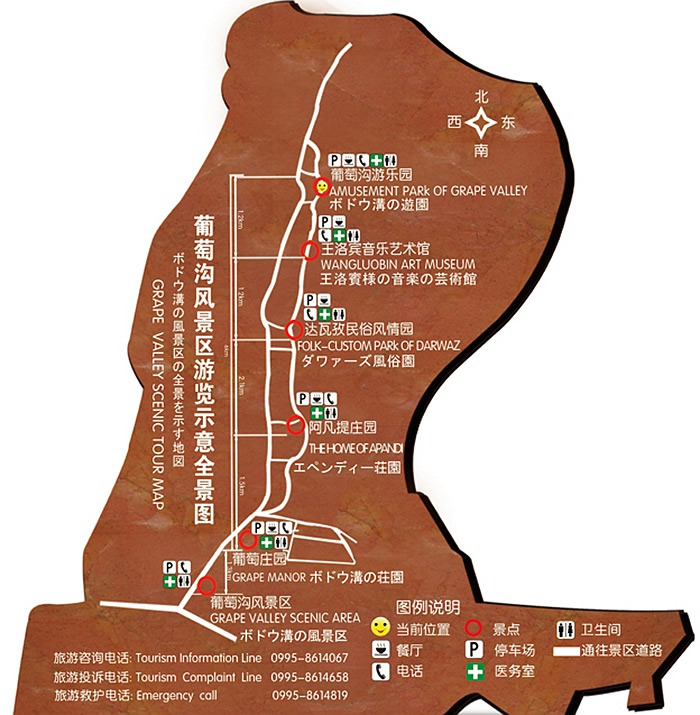 吐魯番市的葡萄溝位于吐魯番市東北15公里處的葡萄鎮(zhèn),距城市中心10公里,海拔300米。葡萄溝系火焰山西側(cè)的一個(gè)峽谷,南北長(zhǎng)8公里,東西寬0.6-2.0公里,溝谷狹長(zhǎng)平緩。溝谷西岸,懸崖對(duì)峙,崖壁陡峭,猶如屏蟑。溝內(nèi),溪流環(huán)繞,水質(zhì)純凈。