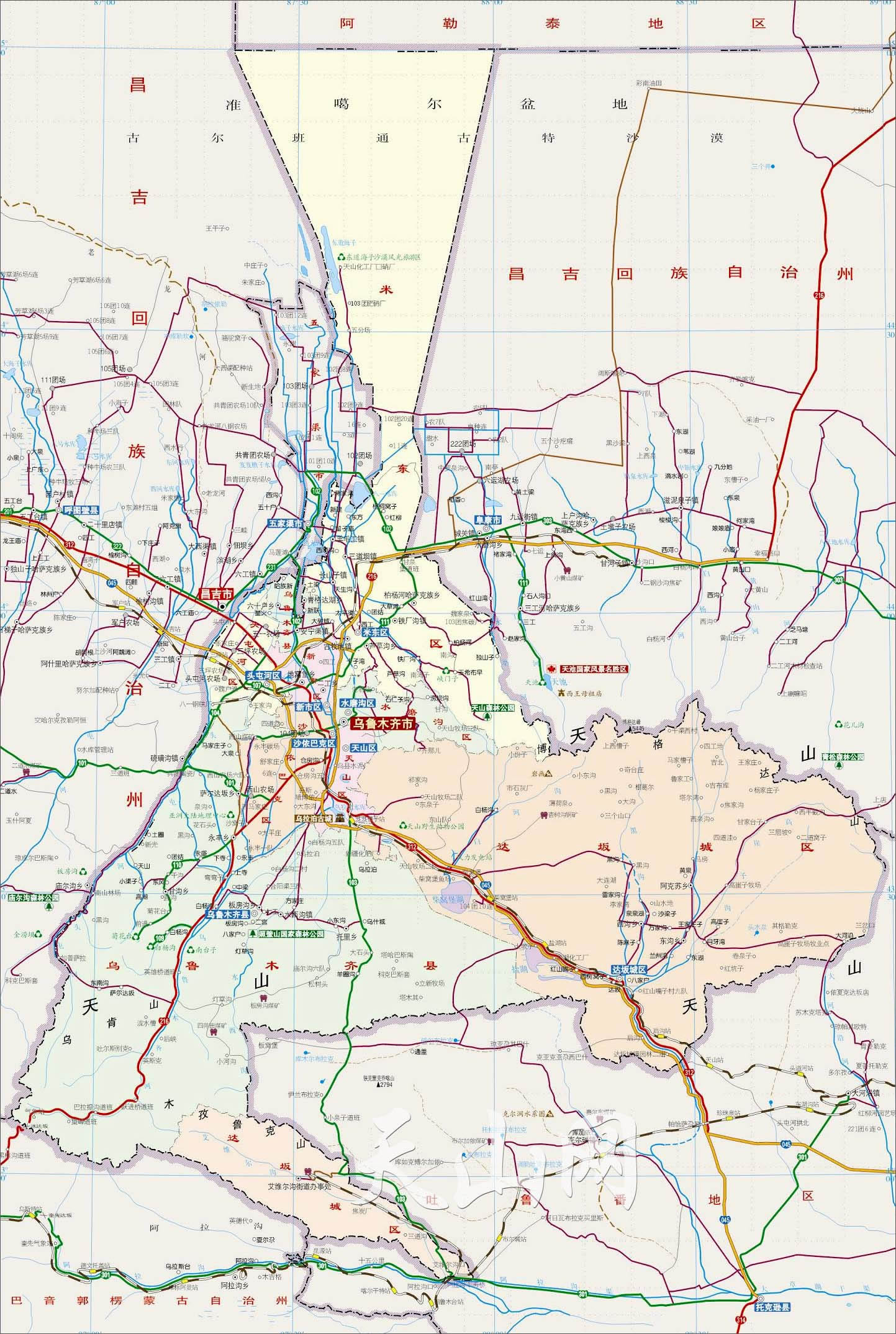 烏魯木齊市位于中國西北,新疆中部,亞歐大陸腹地,地處北天山北麓,準(zhǔn)噶爾盆地南部。東以恰克馬克塔格至大河沿一線與吐魯番市接壤;西以頭屯河區(qū)與昌吉市為界;南以喀拉塔格-克孜勒伊接南山礦區(qū),突出部分折向東南,沿未日洛克-阿拉溝以東與托克遜縣相連。在夏澤格山脊線3以南與和碩縣毗連;西南與和靜縣為鄰;北部沿博格達(dá)山脊與吉木薩爾縣、阜康市分界?偯娣e1.38萬平方千米。
