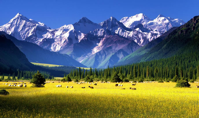 地形地貌 昭蘇縣為中亞內(nèi)陸腹地一個(gè)群山環(huán)抱的高位山間盆地,由于四周高山環(huán)抱,形成了一個(gè)較為獨(dú)特的自然生態(tài)環(huán)境,海拔在1323米-6995米之間。南部為天山主脈,山勢(shì)雄偉,高峻綿亙,是阻擋南疆沙漠干熱風(fēng)的天然屏障;北部為烏孫山,呈東西走向,山體較矮;西部受沙爾套山以及哈薩克斯坦境內(nèi)查旦爾山的阻隔,形成一個(gè)南、西、北三面高,東部略低的盆地。山地、丘陵與平原之比為4∶1。號(hào)稱(chēng)“天山之父”的汗騰格里峰,位于西南部的中哈邊境線上,海拔6995米,是天山山脈第二大高峰,終年積雪區(qū)達(dá)100平方公里以上,是特克斯河的主要水源。是新疆境內(nèi)唯一一個(gè)沒(méi)有荒漠的縣。