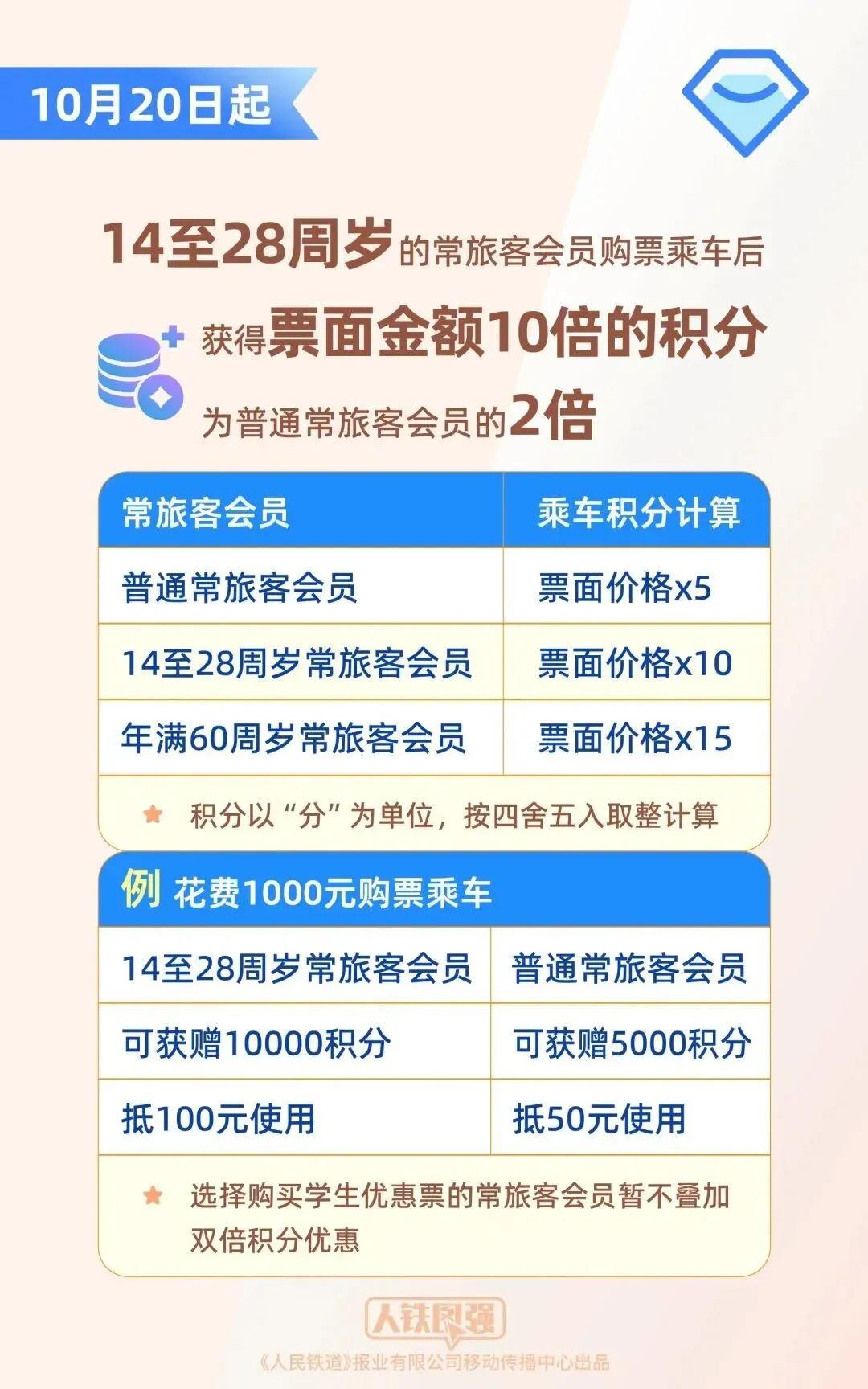 10月20日起,14至28周歲的常旅客會員購票乘車后將獲得票面金額10倍的積分,為普通常旅客會員的兩倍,即普通常旅客會員花費(fèi)1000元購票乘車,可獲贈5000積分、抵50元使用;