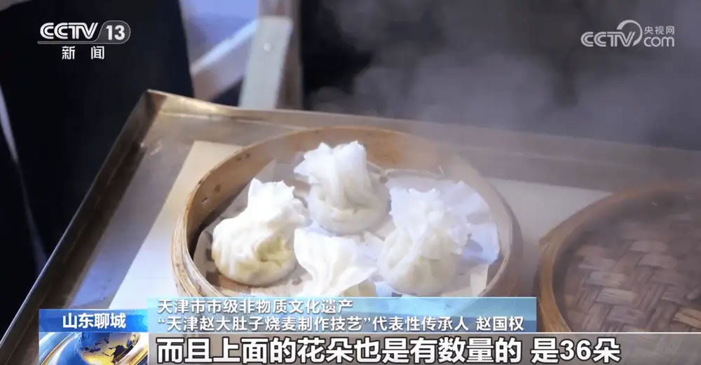 天津市市級非物質(zhì)文化遺產(chǎn)“天津趙大肚子燒麥制作技藝”代表性傳承人 趙國權(quán):趙大肚子燒麥最大的特點(diǎn)是皮子特別薄,上面的花朵也是有數(shù)量的,是36朵。一邊24朵一邊12朵,代表著中國的24個(gè)節(jié)氣和一年的12個(gè)月份。
