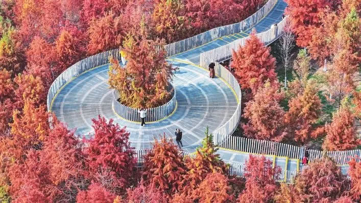 12月15日,漢口常青人才公園,大片火紅的杉樹林和空中觀景棧道完美適配,隨手一拍都是冬日美圖大片,成為市民熱門的打卡地。經(jīng)歷上一輪寒潮,武漢水杉、池杉、落羽杉齊刷刷變紅,紅杉進(jìn)入最佳觀賞期。 楚天都市報極目新聞記者李輝攝